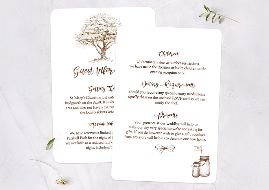 Including wedding information for guests not only reduces stress and confusion but also helps avoid cluttering your main invites. Here are ten key details to consider including on your guest information cards to keep everyone informed and organised.