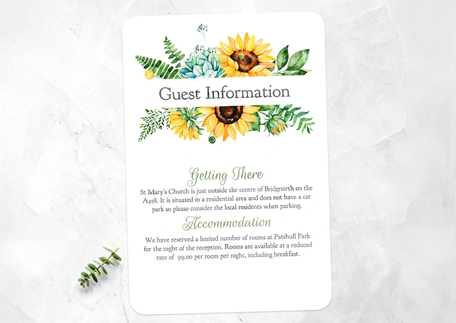 If you have organised hotel rooms at a discounted rate, note this on your guest information card along with booking instructions. It’s also considerate to suggest alternative accommodation options at different price points for guests who may prefer something nearby but more affordable.