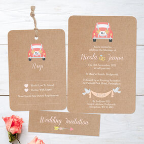 This adorable wedding invitation suite is a unique way to announce your wedding day! The invitation features a vintage car, embellished with floral decorations and a number plate bearing the initials of you and your partner. The pink car stands out against a rustic paper background, which has a more bohemian feel. Your personalised wording is decorated with wedding rings, love birds, and love heart arrows adorned with flowers.