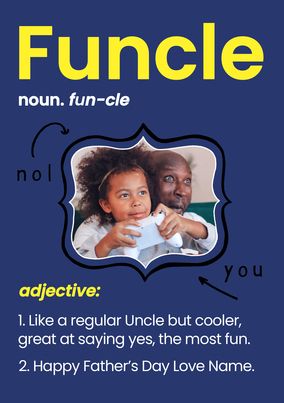Celebrate your favourite uncle this Father's Day with a nice and lovely card to warm his heart. Choose in our selection of funny or thoughtful uncle Father's Day cards. Use our online editor to upload his best photos and add his name.