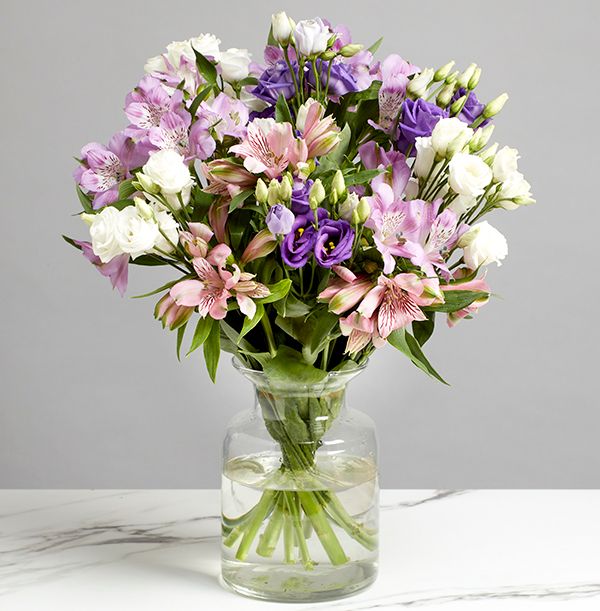Bouquet includes: 3 x Blue Lisianthus, 3 x White Lisianthus, 3 x Purple Alstroemeria, 3 x Pink Alstroemeria