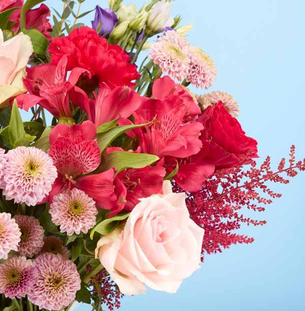 Bouquet includes: 2 x Astilbe Red, 2 x Lisianthus Purple, 2 x Rose Cerise, 2 x Rose Pink Athena, 2 x Carnation Cerise, 2 x Alstroemeria Cerise, 3 x Santini Doria Pink, 1 x Eucalyptus Parvi.
