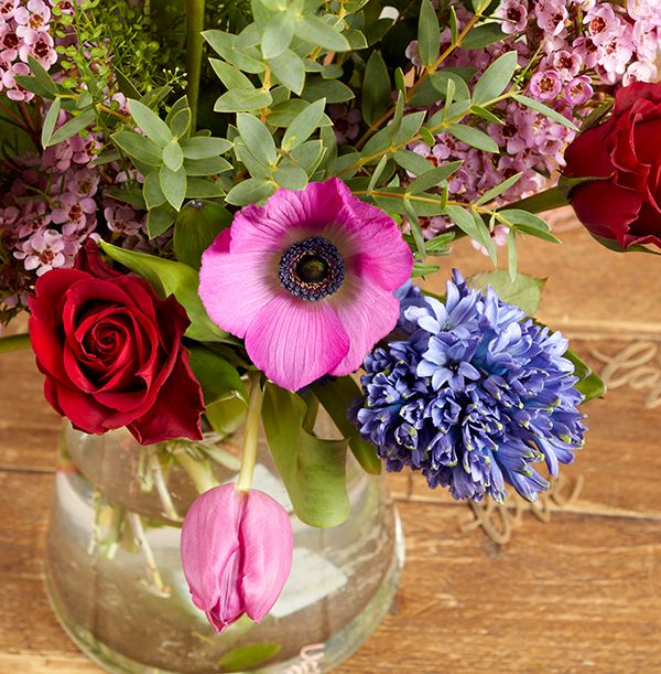 Bouquet includes: 3 x Rose Furiosa, 3 x Anemone Cerise, 2 x Blue Hyacinth, 3 x Purple Tulip, 2 x Pink Waxflower, 1 x Eucalyptus Cinerea, 1 x Eucalyptus Parvifolia, 1 x Greenbell.