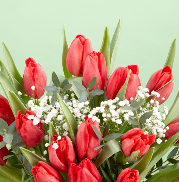 Bouquet includes: 16 x Tulip Red, 1 x Gypsophila, 2 x Eucalyptus Parvie, 1 x Grey Jug.