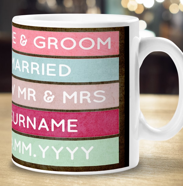 Create a unique mug for the happy couple with this personalised design from the Next Stop Happy Street in house range from Funky Pigeon.