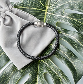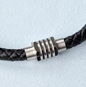 A Black Leather Bracelet with Stainless Steel Ribbed Clasp